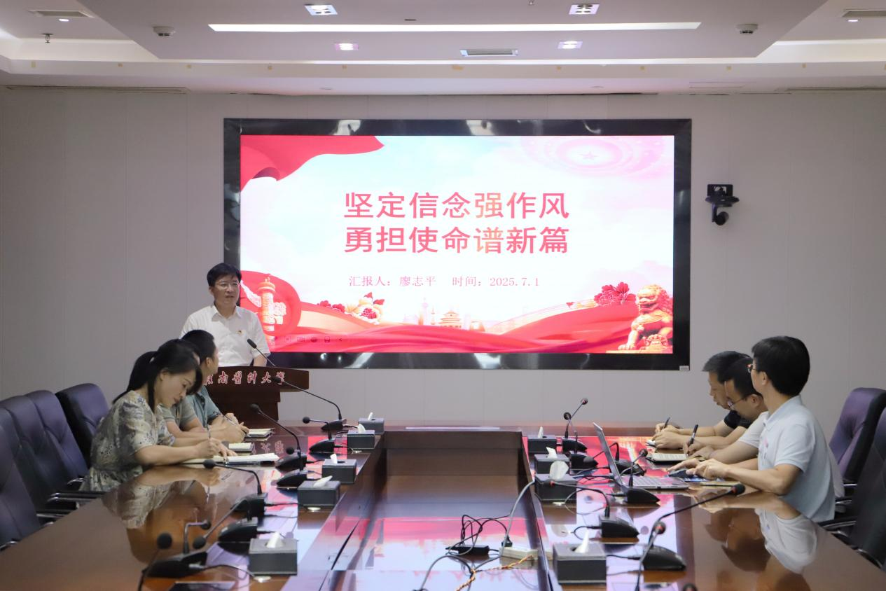 7月1日下午,学校党委常委、宣传部部长廖志平以《坚定信念强作风 勇担使命谱新篇》为题,为机关党委第三党支部全体党员讲授深入贯彻中央八项规定精神学习教育专题党课。